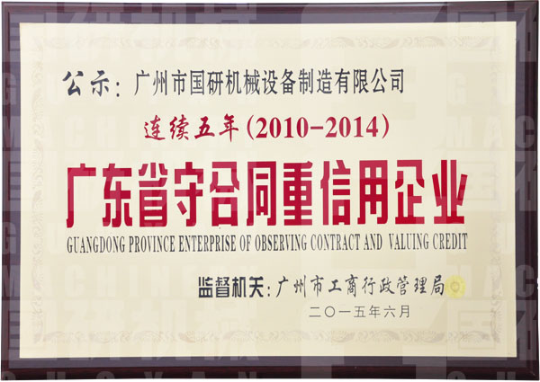“连续五年(2010-2014)广东省守合同重信用企业”的牌匾在广州市江南手机网页版_江南jiangnan(中国)设备制造有限公司的文化展示墙上格外引人注目,这是对公司多年坚持诚信经营的充分肯定,也是公司企业文化“诚信、创新、分享、精进”的客观体现。